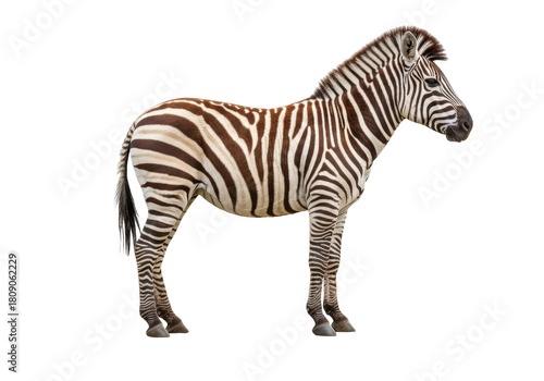 Isolated zebra standing and looking forward gracefully, in full view and in side profile