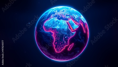 Isometric 3D Earth Globe Illuminated with Pink and Blue Neon Glow Displaying Africa Europe Asia on Dark Blue Background for Earth Day Celebration and Technological VFX Element