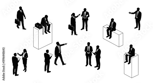isometric business people in silhouette discussing pointing and meeting