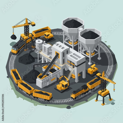 Isometric Coal Mining and Processing Plant with Trains and Heavy Machinery.