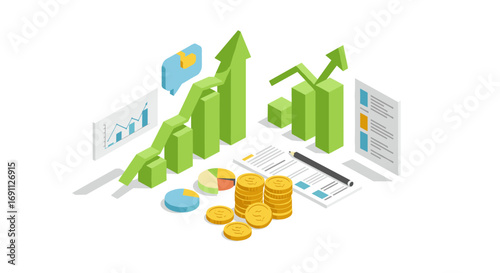 Isometric financial growth charts with coins and documents on white background