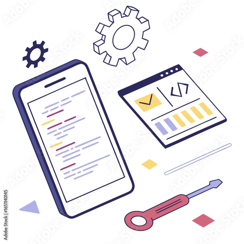 Isometric illustration of a smartphone displaying code and a web browser interface with gears and a screwdriver symbolizing app development and digital technology