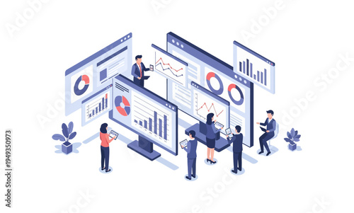 Isometric illustration of business people analyzing data on multiple screens.