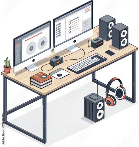 Isometric Modern Workspace with Dual Monitors, Speakers, and Headphones