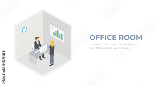 Isometric office room interior concept vector. Business characters male and female. Two people in office concept.