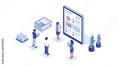 Isometric view of a business presentation with charts and data analysis and people collaborating together
