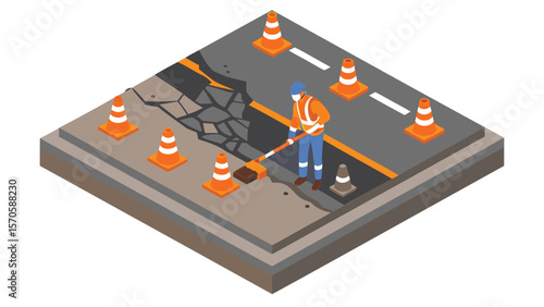 Isometric view of road repair with worker cones and damaged asphalt section being fixed precisely