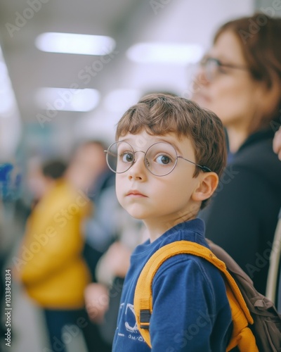 italian boy which are 6 years old with round glasses and blue shirt walks down the aisle in hospital with his mom and dad.