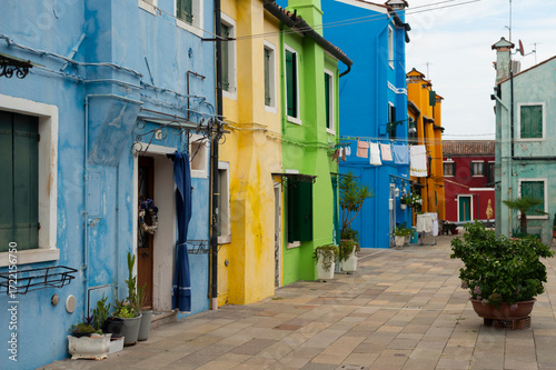 Italian postcard, picturesque street scene in Burano, showcasing its iconic colorful facades. Evokes wanderlust and timeless beauty.