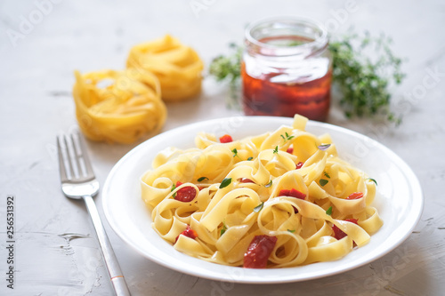 Italian traditional pasta tagliatelle with dried tomatoes and thyme on a light background.