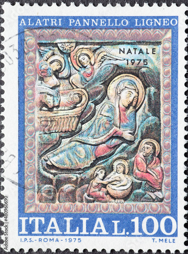 Italy - circa 1975: a postage stamp from Italy showing christ in the stable. Nativity. Christmas Postage stamp 1975