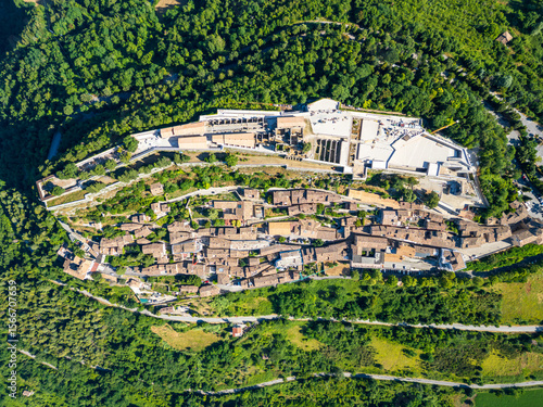Italy, July 4, 2025: Aerial view, from the drone, of the medieval village of Civitella del Tronto, in the province of Teramo, in Abruzzo. Here you can breathe peace and tranquility and history.