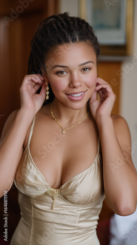 Ivory satin dress with earrings indoor portrait