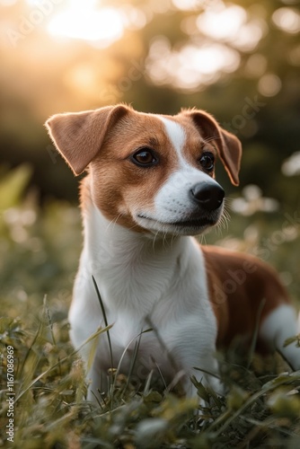 Jack Russell terrier dog runs through the grass on a sunny summer day. close up. the background is out of focus.