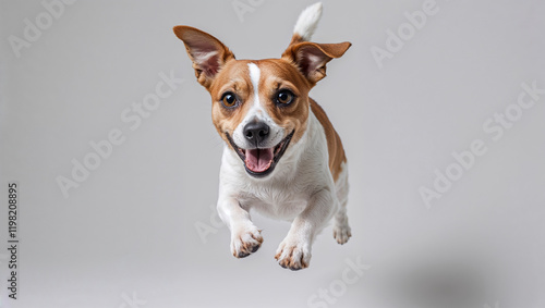 Jack Russell Terrier jumping in the air on white background. Isolate. National dog day, international pet day, national puppy day