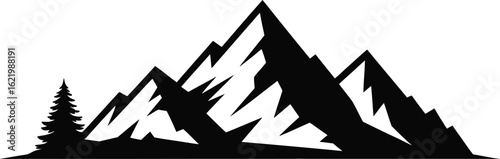 Jagged mountain peaks and pine tree silhouette black