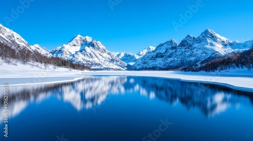 Jagged snow-capped mountains reflected in a frozen lake with clear skies and a serene winter landscape
