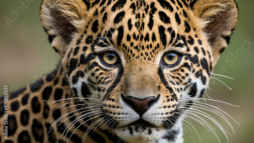 Jaguar cub closeup showing small rosettes and wide eyes with plain background