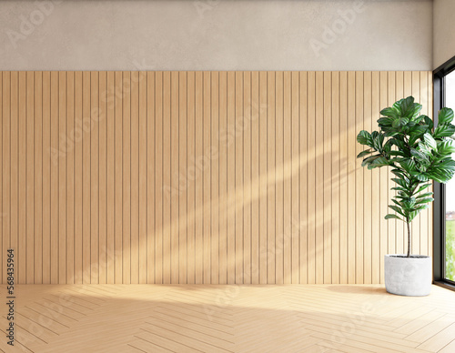 Japan style empty room with wood pattern wall and indoor green plants. 3d rendering