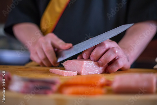 Japanese chef is neatly cutting on fine meat