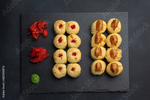 Japanese cuisine. Delicious fried rolls with salmon
