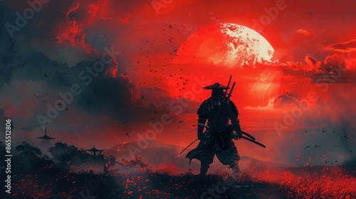 Japanese samurai warrior with a red sun on the background