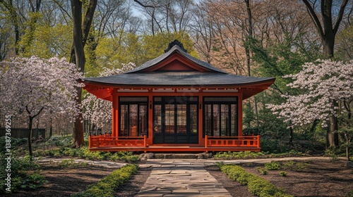 Japanese tea house in a serene garden