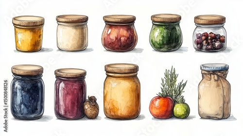 Jars with different contents, arrayed across a white surface, watercolor style