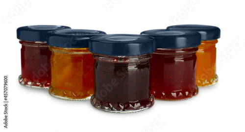 Jars with different jams on white background
