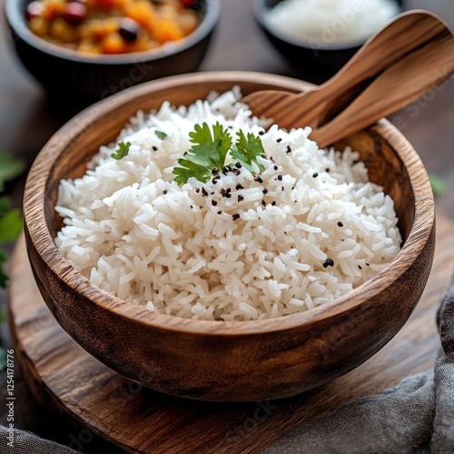 Jasmine rice in a traditional wooden bowl with stirring spoon and a side of spicy chutney