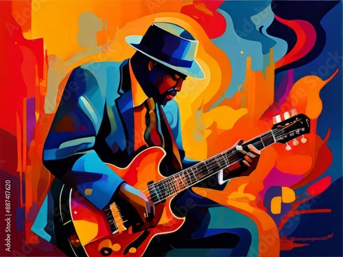 Jazz in pop art style. A bright abstract painting by a musician. Whirlwinds of color and shapes create dynamic and expressive works of art. AI Generated.