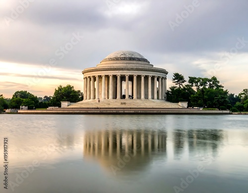 Jefferson Memorial Reflection at Sunrise - A Serene Washington D.C. Landmark.
