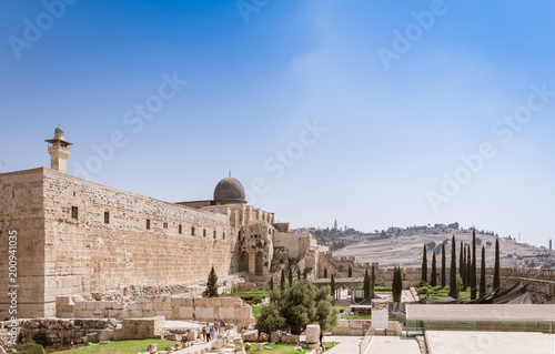 Jerusalem old city. Temple mount, Al aqsa mosque and Olive mount are christian muslim and jewish holy places.
