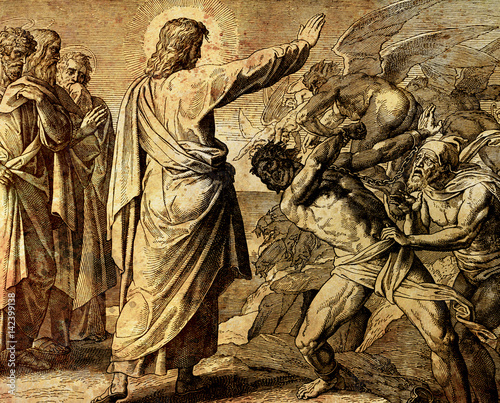 Jesus restores possesed man, graphic collage from engraving of Nazareene School, published in The Holy Bible, St.Vojtech Publishing, Trnava, Slovakia, 1937.