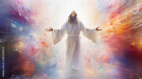 Jesus stands with open arms in a beautiful place bathed in colors