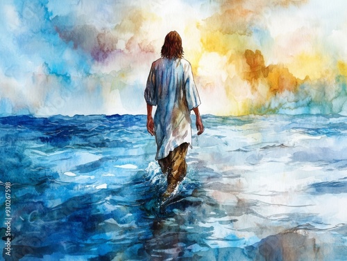 Jesus walking on water in soft watercolor hues, peaceful sea in the background, Jesus miracle, serene and divine scene