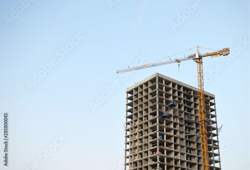 Jib construction tower crane at a construction site on the blue sky background - Image