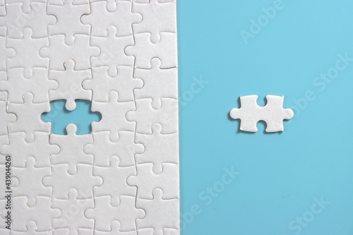Jigsaw puzzle with missing piece. Missing puzzle pieces. Concept image of unfinished task. Completing final task, missing jigsaw puzzle pieces and business concept with a puzzle piece missing. blue