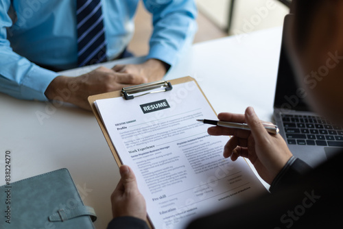 Job interviews, Employer in suit reading resume of job interview candidate profile collection. Man explaining profile to a manager sitting for a job interview. Job Search and Human Resources