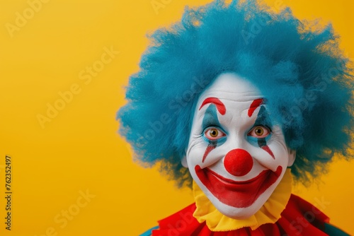 Jovial clown with vivid blue afro wig, classic red nose beams with smile, bringing warmth, comedy against stark yellow background. Circus artist laughs while looking at the camera. April Fools Day