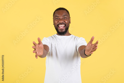 Joyful African Man Stretching Hands To Camera Over Yellow Background