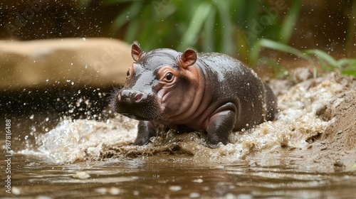 Joyful Baby Pygmy Hippo Having Fun Sliding Into Water with Splash