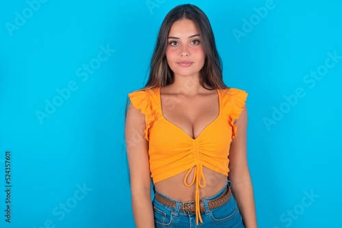 Joyful beautiful brunette woman wearing orange tank top over blue background looking to the camera, thinking about something. Both arms down, neutral facial expression.