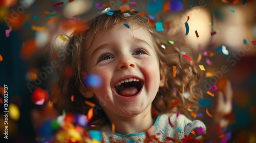 Joyful caucasian young child surrounded by colorful confetti celebrating happiness