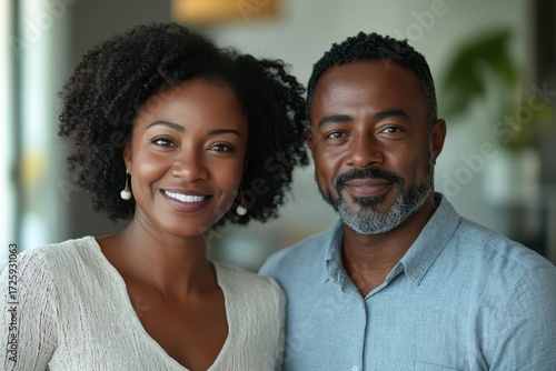Joyful couple smiling warmly in a modern interior during a bright afternoon
