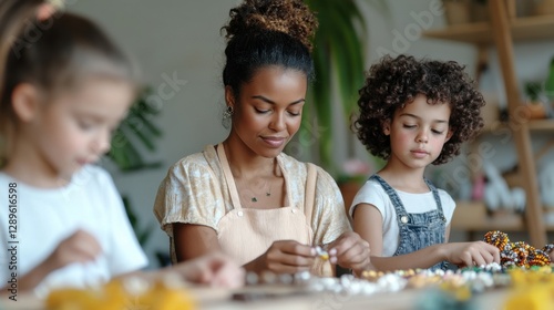 Joyful Family Time: Multiracial Mother and Child Engaged in Creative Craft Activity at Home. Generative ai
