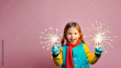 Joyful Girl with Bright Gloves Lighting Fireworks in Soft Pastel Background
