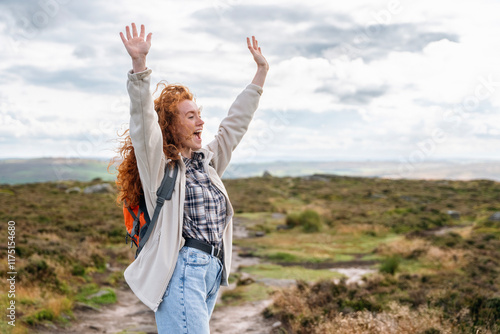 Joyful hiker celebrates reaching the top of a scenic trail in the countryside