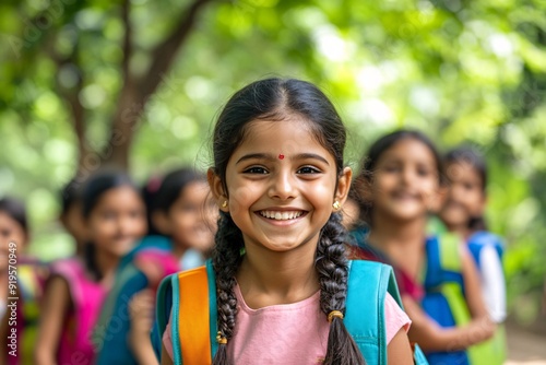 Joyful Indian Schoolgirl Smiling with Friends Outdoors