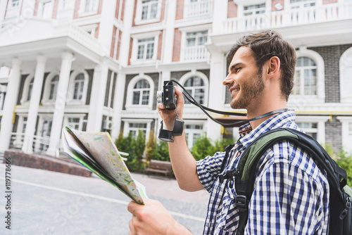Joyful male tourist walking with camera